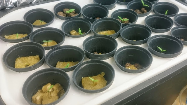 Wykiełkowane rośliny po selekcji trafiły z wacików do kostek wełny mineralnej, kostki w koszyczkach trafiły do hydropszedszkola.